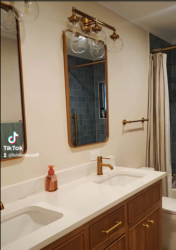 The gold-framed mirrors and spherical wall sconces provide a warm, inviting glow. Installing the sconces was a bit of a challenge due to the old wiring, but the end result was worth the effort. The white toilet, modern bathtub, and sleek single-handle faucet, paired with 4×4 tiles, create a sophisticated and contemporary look. Finding the perfect tiles was a journey in itself; we visited several suppliers before settling on these gems.